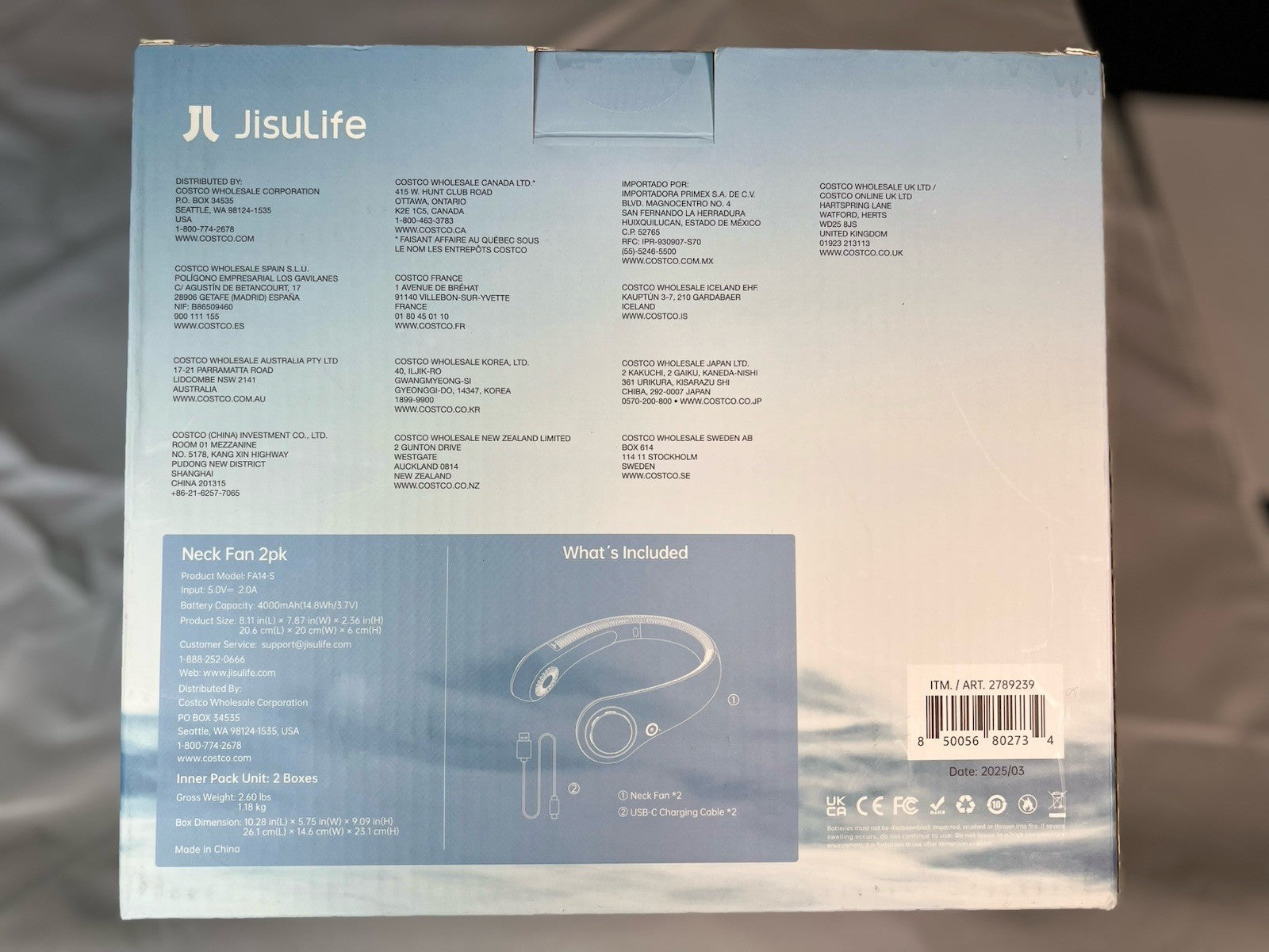 STAY COOL with this brand new JISULIFE Neck Fan 2 pack in white. They are a powerful portable ventilation fan with a bladeless design, perfect for hands-free use. It has 5 speeds and can be powered by USB or battery, offering 4-16 hours of working time. This ultra-light design fan is cordless and features low noise operation, making it ideal for on-the-go use. The 2-pack includes two fans, each weighing just 0.56lbs, for convenient and lightweight cooling in various settings.